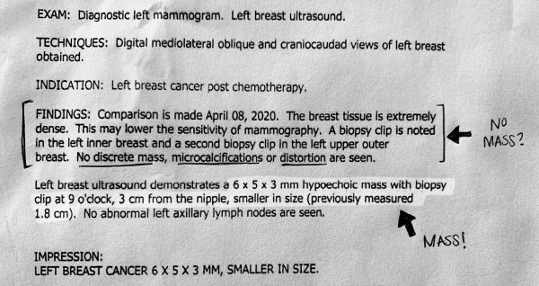 I’m going to post pictures below of my mammogram and ultrasound impressions to give you an example.